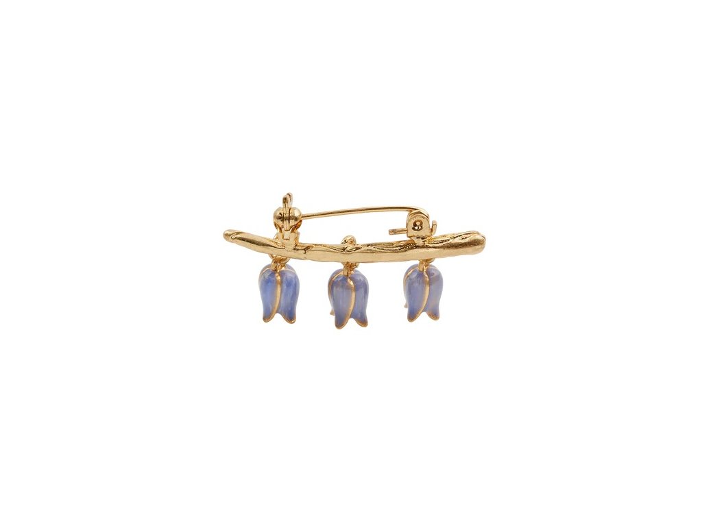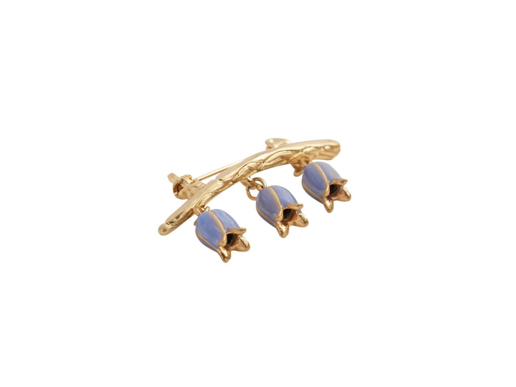 Naše brož se zvonky tento okamžik ztělesňuje třemi pečlivě ručně malovanými smaltovanými květy zavěšenými na jemné pozlacené větvičce.