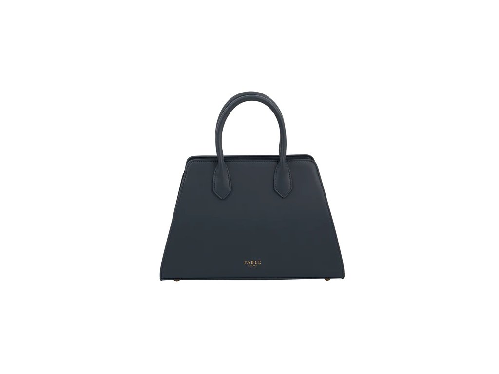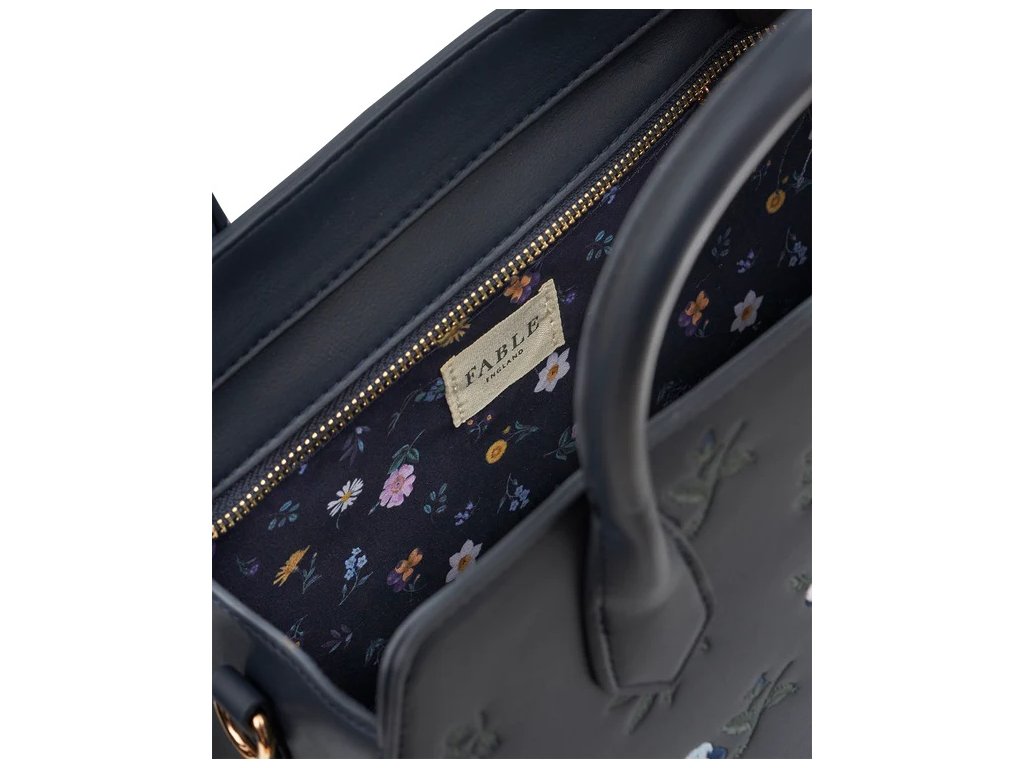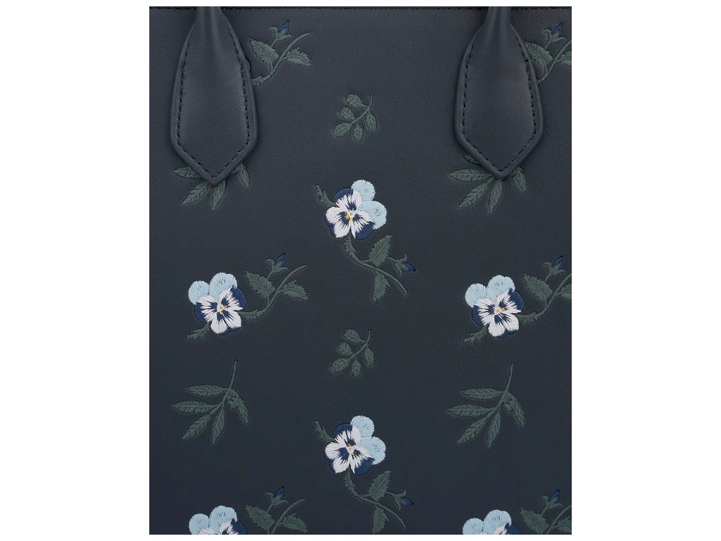 Prostorná kabelka v odstínu tmavě modré s výšivkou s motivem modrobílých macešek.