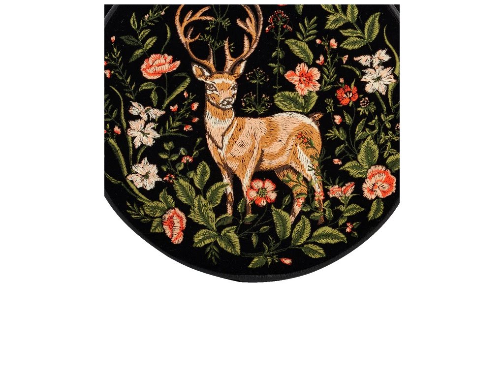 Tato vyšívaná kruhová kabelka, navržená k vyprávění příběhu o slunovratu, zobrazuje jelena na pozadí květin a fauny jako mocného ochránce lesa.