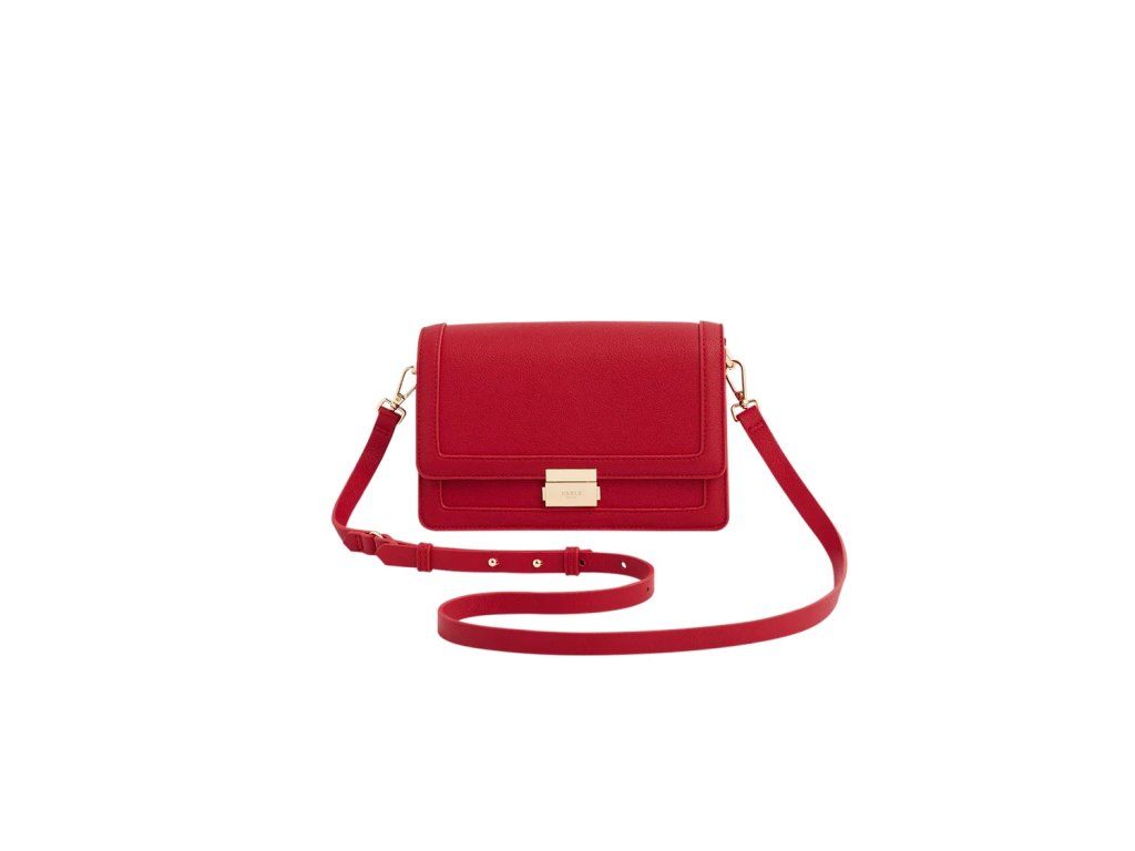 Objevte nadčasovou klasiku s naší červenou skládací kabelkou Kate. Je vyrobena z karmínové umělé kůže a třpytí se leštěnými zlatými detaily, které vašemu outfitu dodají nádech třpytu. Odnímatelný ramenní popruh dodává všestrannost a umožňuje aby vás tento nadčasový kousek s ležérním šarmem doprovázel od ranních procházek až po večerní dobrodružství.
