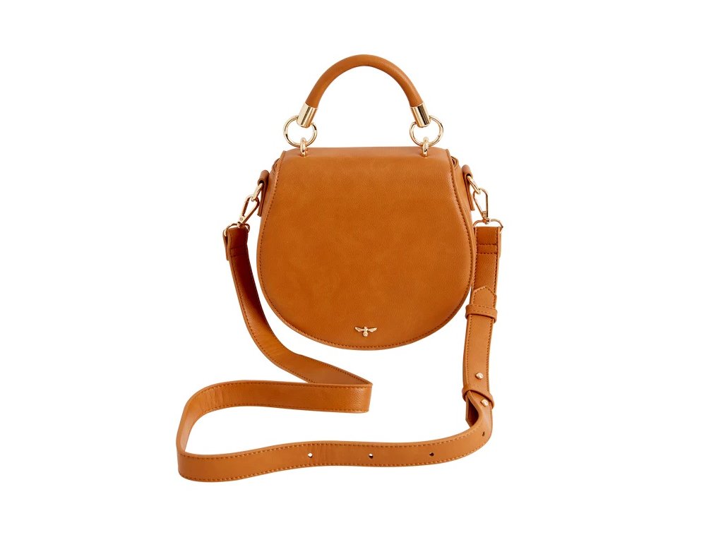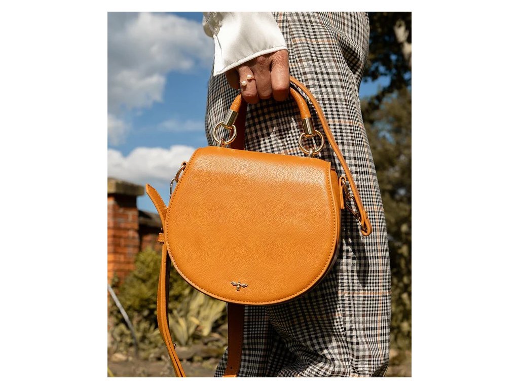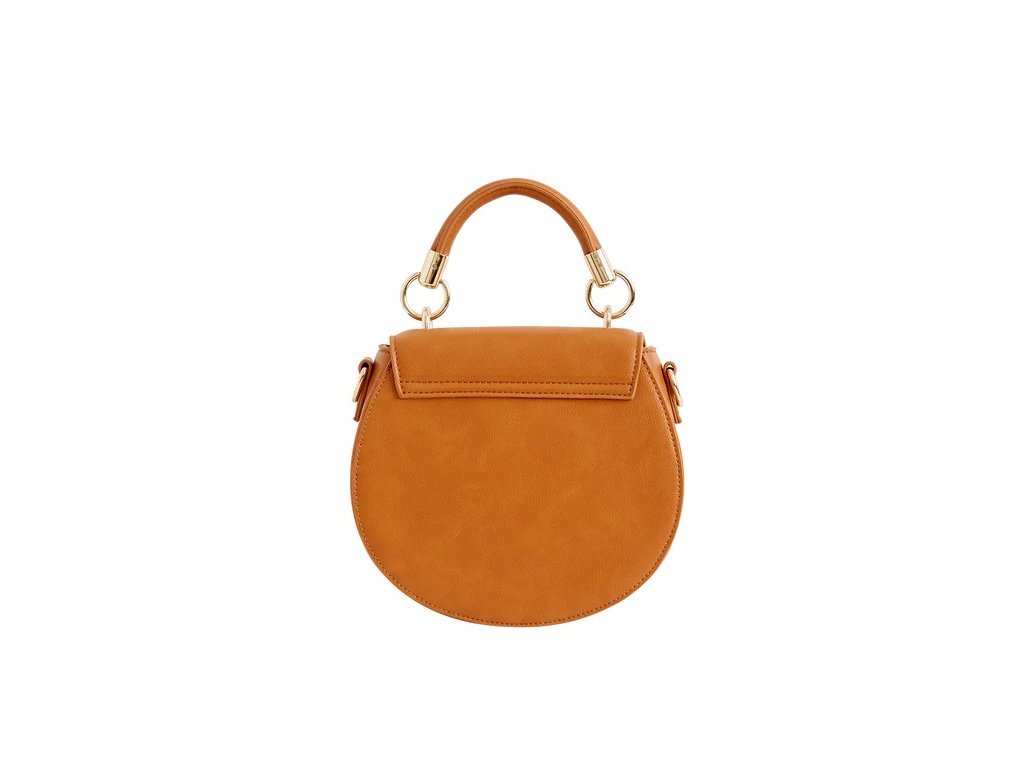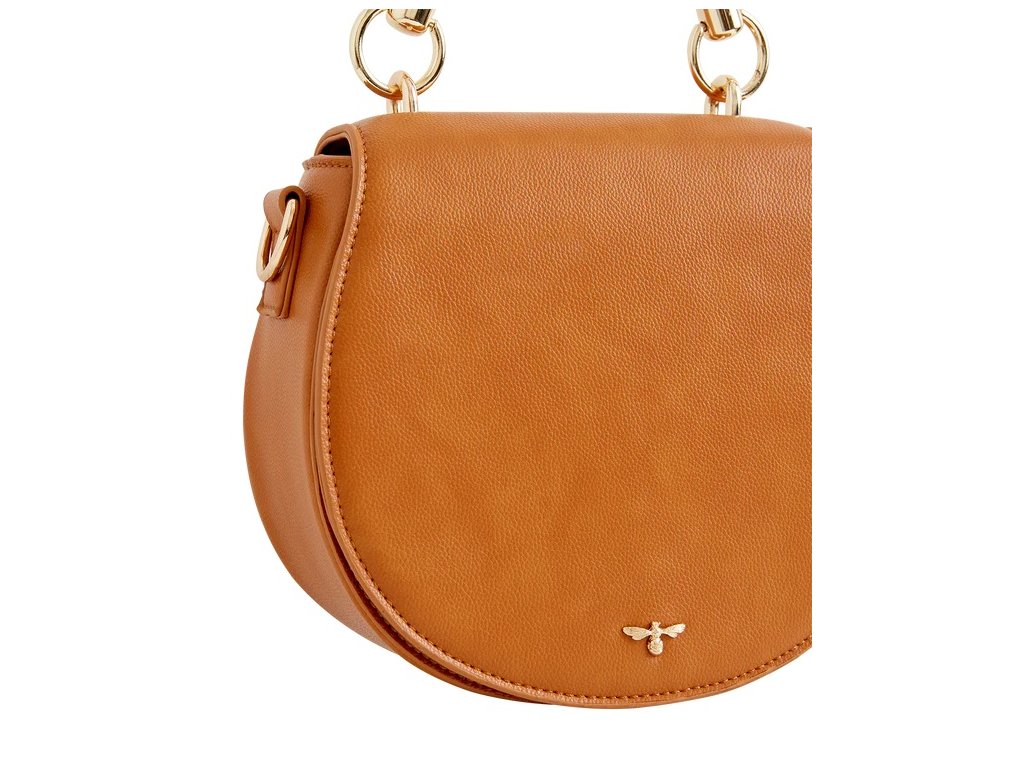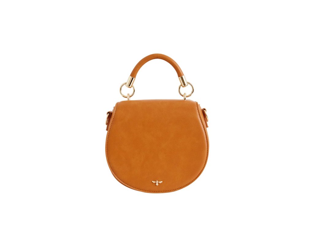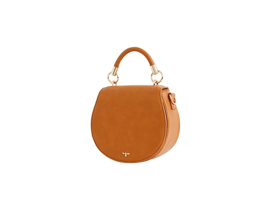 Tato kabelka s zaobleným designem, vyrobená z alternativní kůže v klasické hnědé barvě, evokuje atmosféru venkovského života a připomíná klasickou jezdeckou sedlovou brašnu.