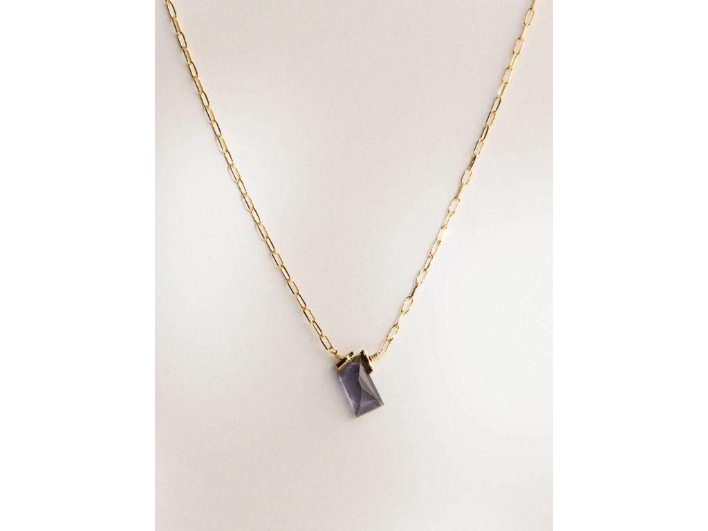 Náhrdelník Ariel je spojením elegance a přírodní krásy. Jeho obdélníkové jemné očka tvoří sofistikovaný řetízek, uprostřed kterého září fialovomodrý kámen iolit. Kameny mají unikátní geometrický brus. Každý je jedinečný, žádné dva náhrdelníky Ariel nejsou stejné. Fialovomodrá barva kamene evokuje vlny oceánu a přináší do vašeho života klid a vnitřní mír.