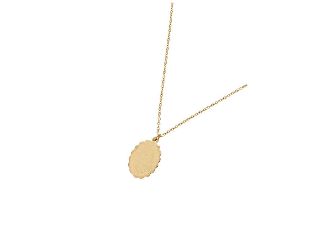 Tento náhrdelník, zasazený do nadčasového zlatého oválného ručně vyřezávaného rámu na jemném řetízku, je perfektním uměleckým dílem.