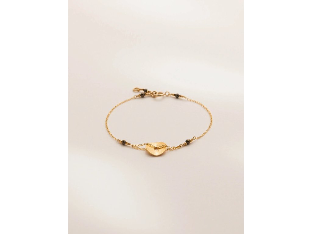 Originální náramek s přívěskem evokujícím slunce je zdoben čtyřmi nádhernými pyrity - dvěmi uprostřed a dalšími dvěmi okolo zapínání.