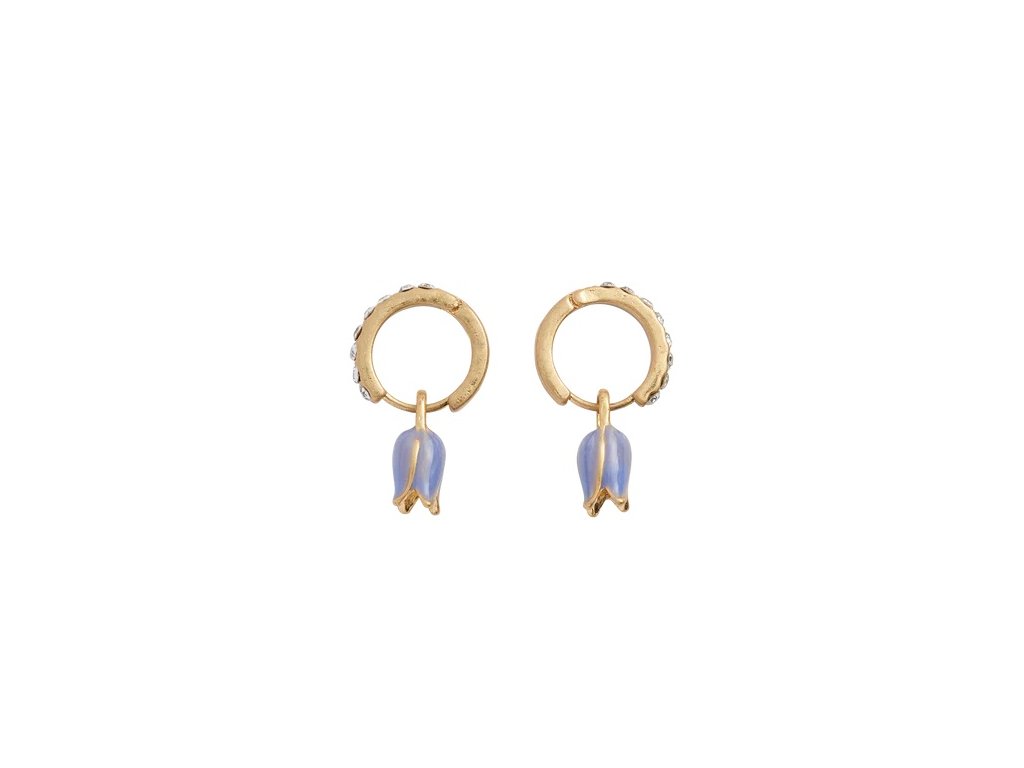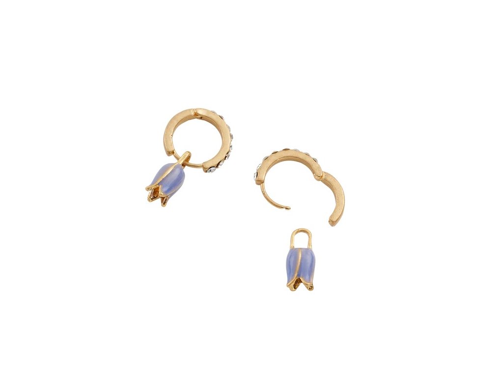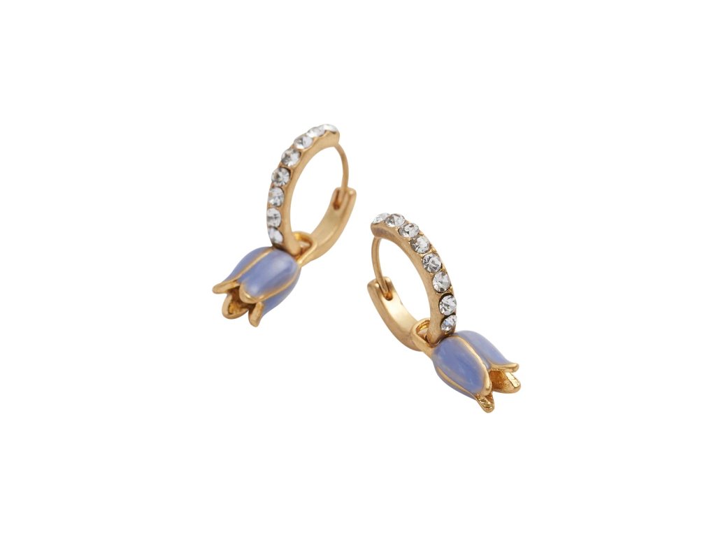 Náušnice s přívěsky Bluebell Charm Huggies tento okamžik ztělesňují ručně malované smaltované květy zavěšené na pozlacených kroužcích zdobených krystaly.