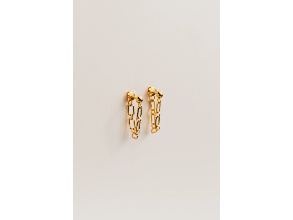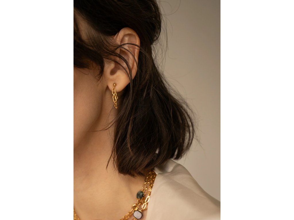 Náušnice má větší hranaté ploché články, díky kterým působí sofistikovaně.
