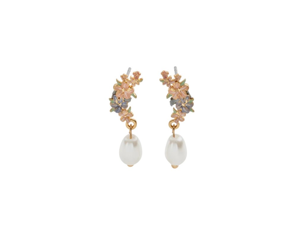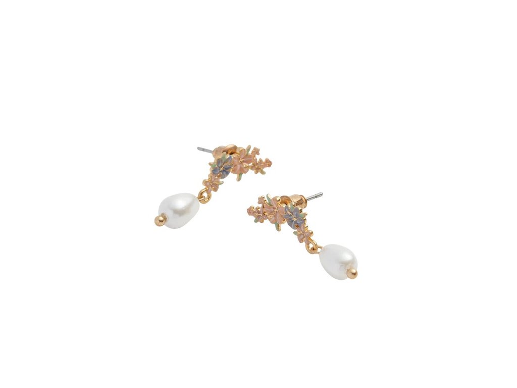 Tyto pozlacené visací náušnice zdobí ručně malované smaltované květy ibišku v jemných pastelových barvách, které jsou zvýrazněny dokonalými umělými perlami.