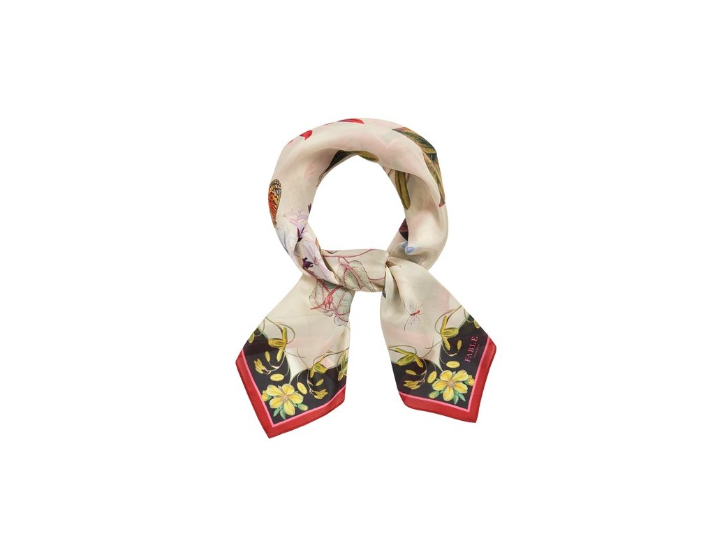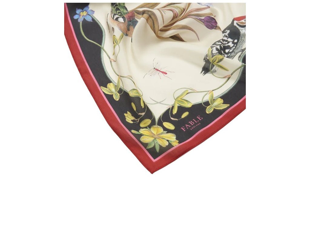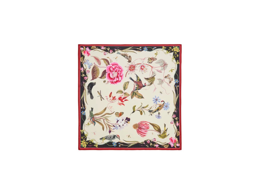 Čtvercový šátek s motivem říše divů s poutavými ilustracemi kvetoucích květin a okouzlujících ptáků vám jistě zvedne náladu, ať už si ho oblečete jakkoli.